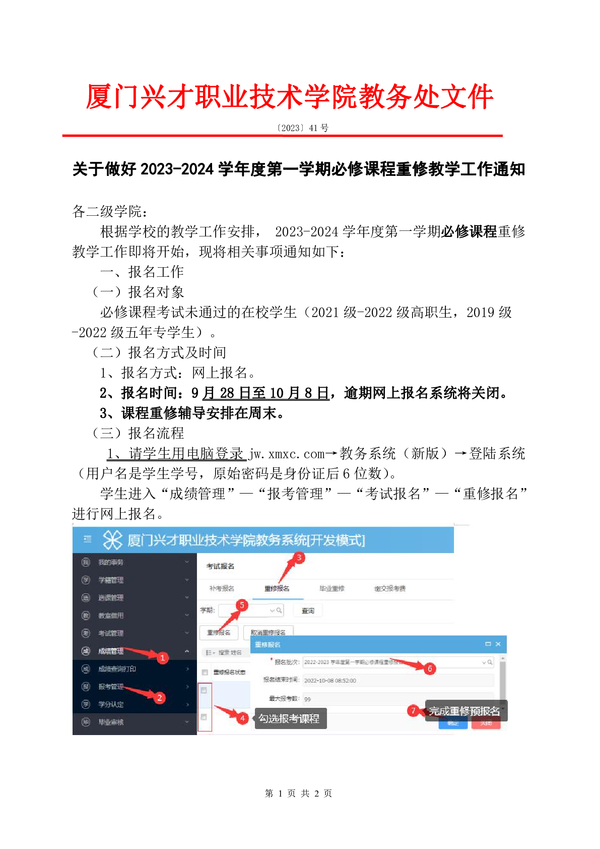 关于做好2023-2024学年度第一学期必修课程重修教学工作通知
