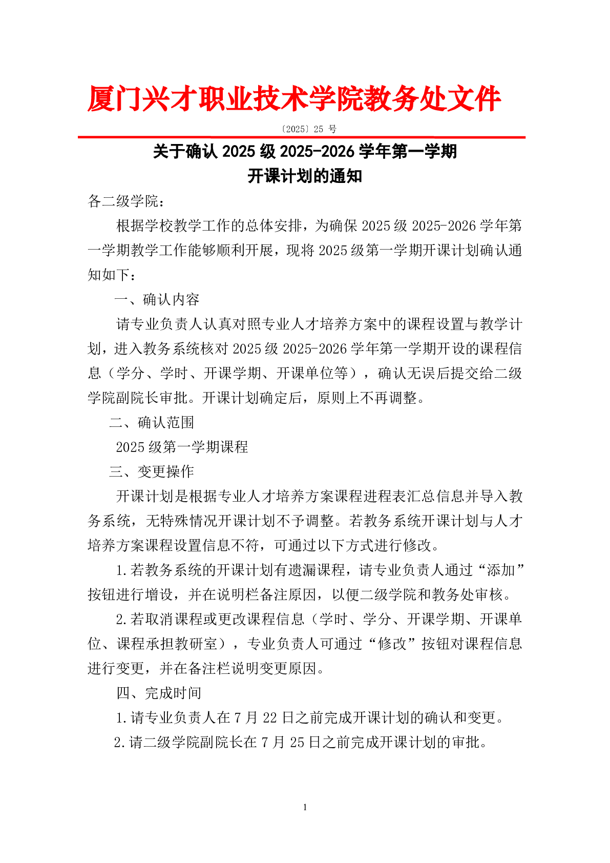 关于确认2025级2025-2026学年第一学期开课计划的通知