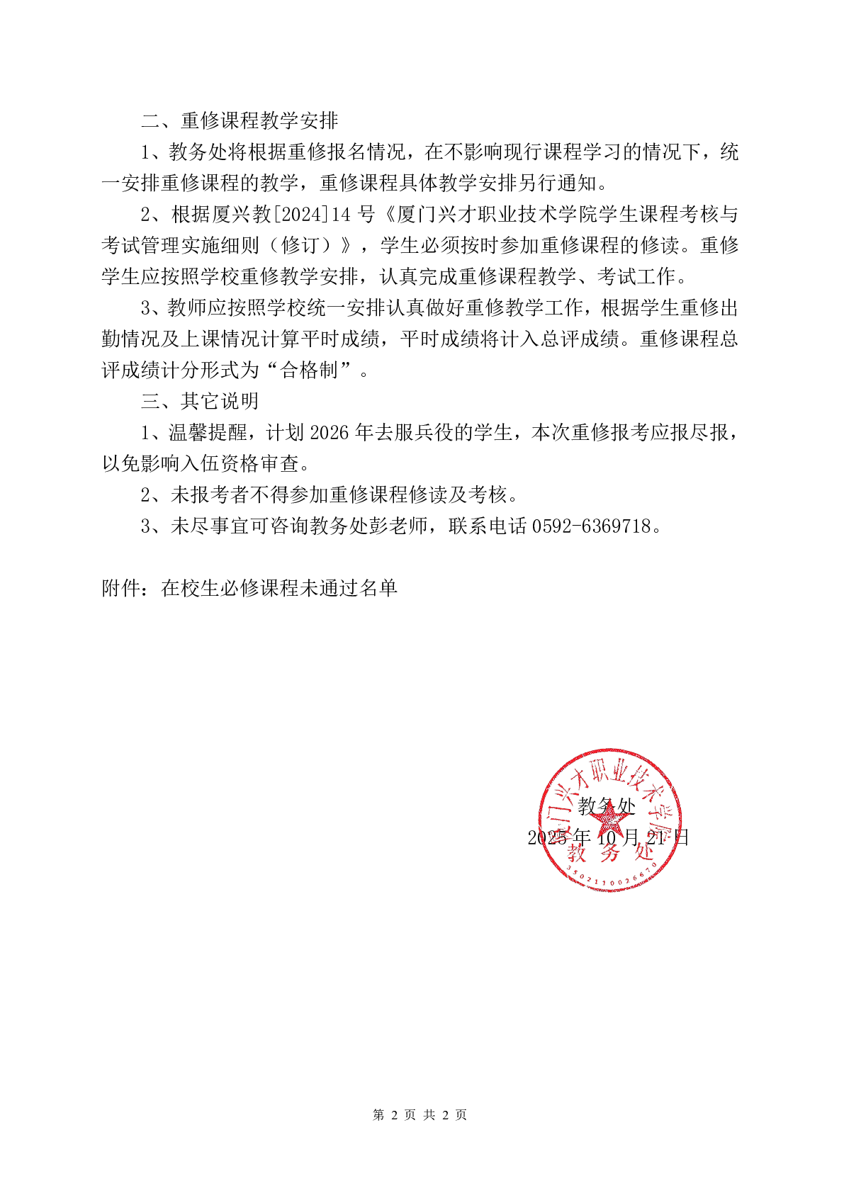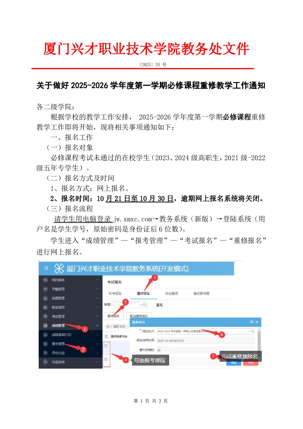 关于做好关于做好2025-2026学年度第一学期必修课程重修教学工作通知
