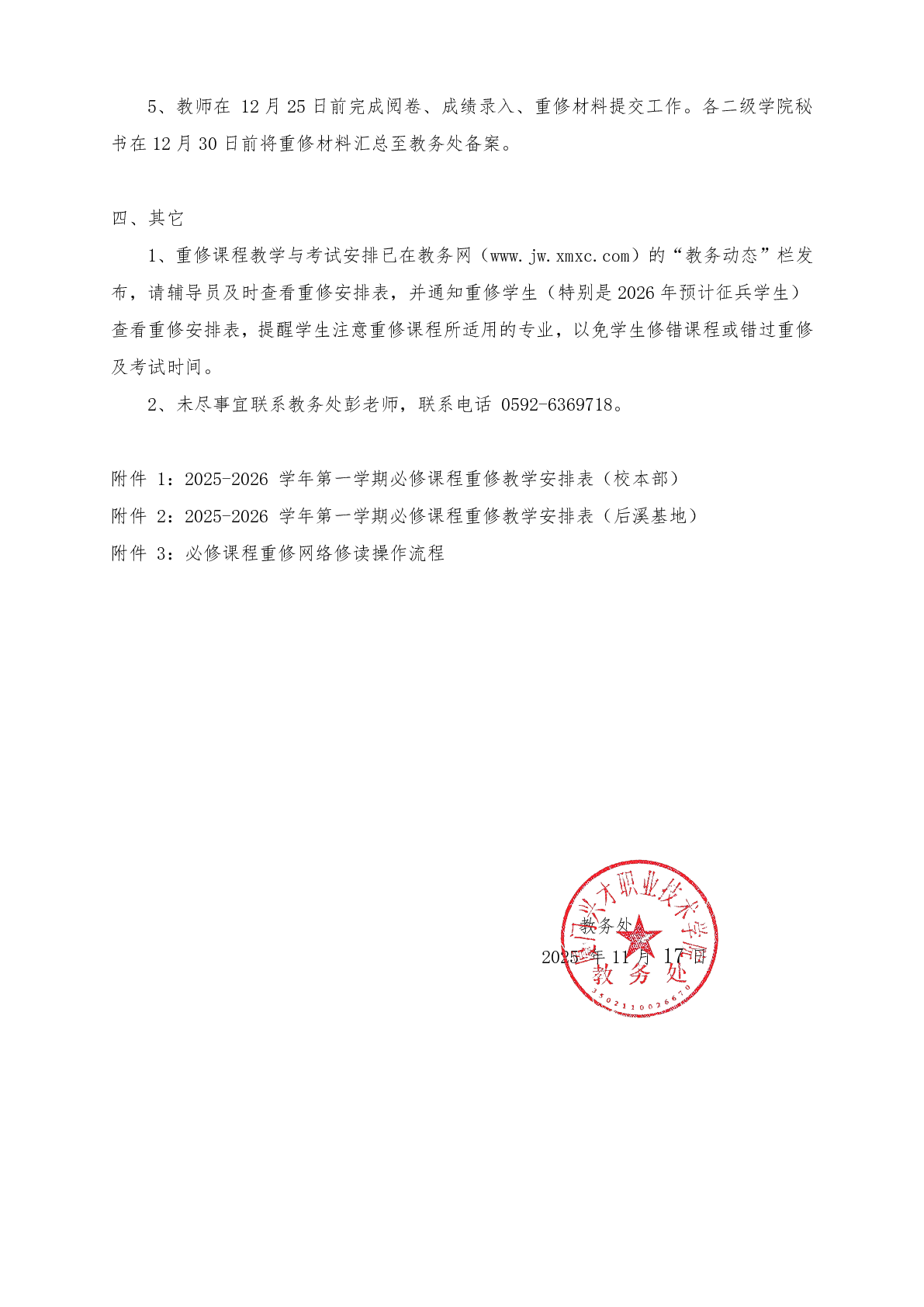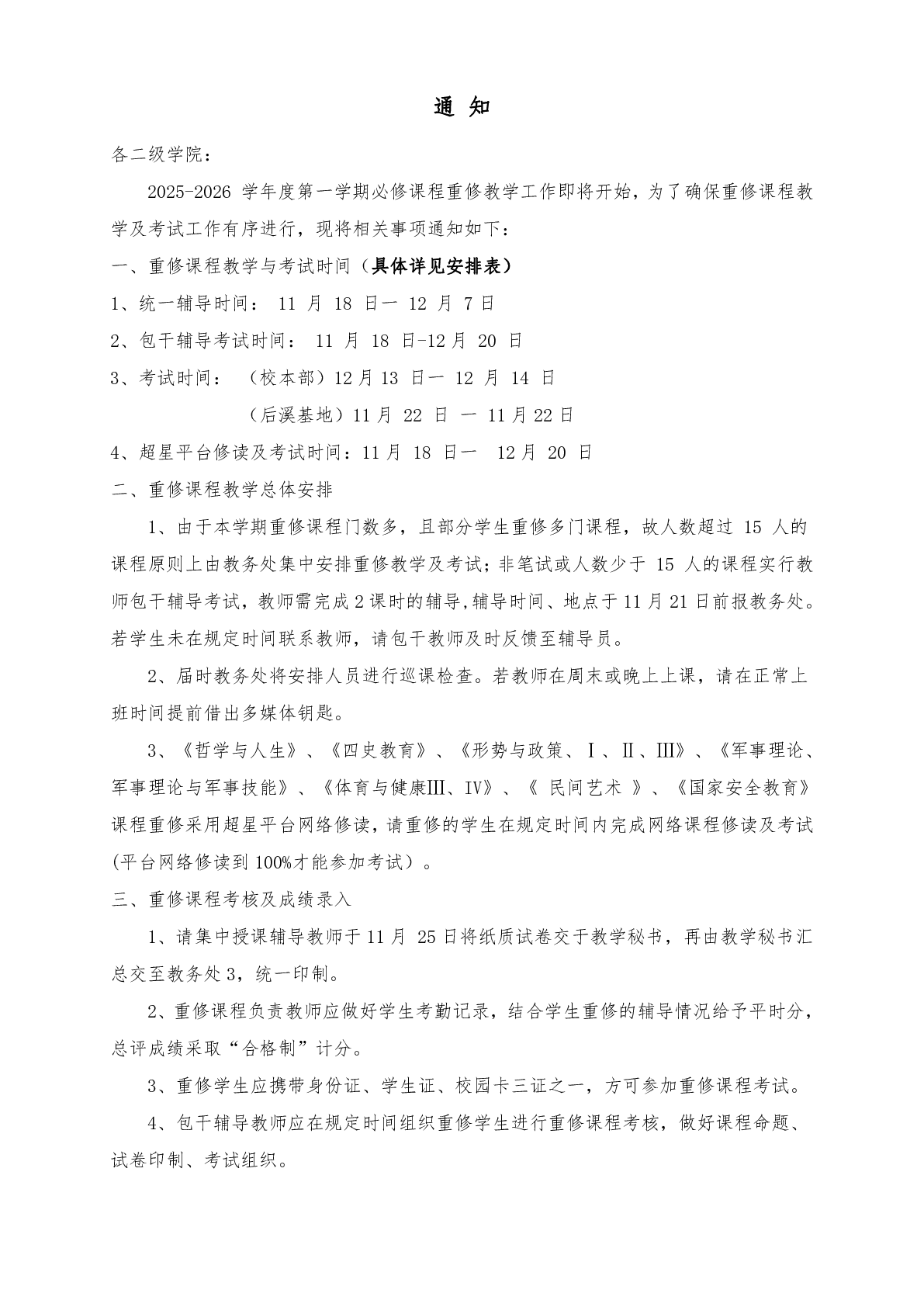 关于做好关于做好2025-2026学年度第一学期必修课程重修教学工作通知