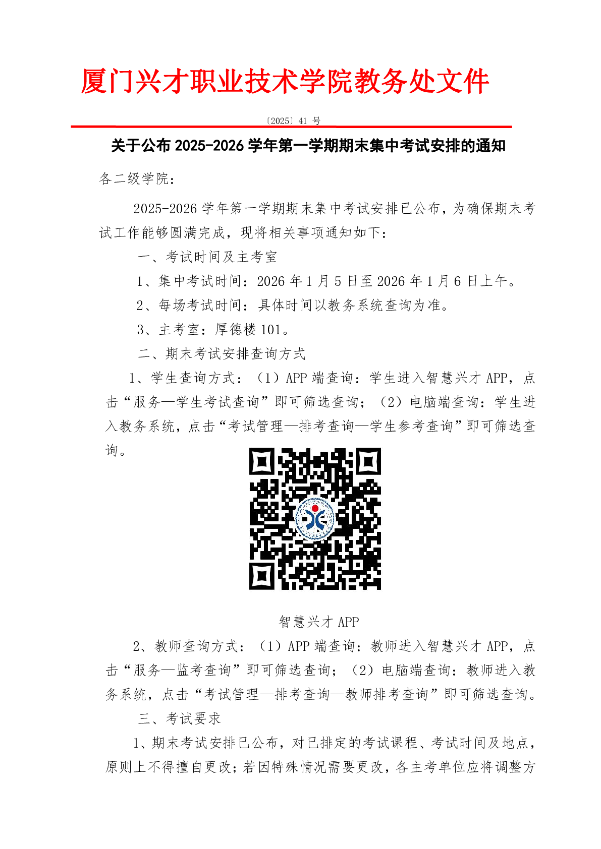 关于公布2025-2026学年第一学期期末集中考试安排的通知